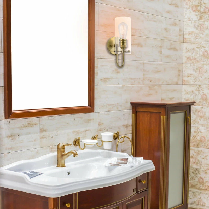 Lighting Direction: DownlightLighting Source Type: Incandescent, LED, CFLMounting Style: WallSafety Rating: ETL ListedLocation Rating: DampShade Shape: CylinderShade Material: GlassFinish Type: Plated/PaintedRecommended Room Type: Indoor, Home, Kitchen, Dining Room, Living Room, Bedroom, Office, Den, Foyer, Hall, Entry, StairwaySpecial Feature: Dimmer Compatible