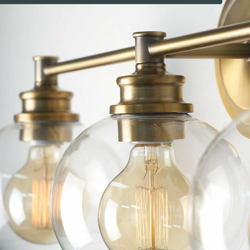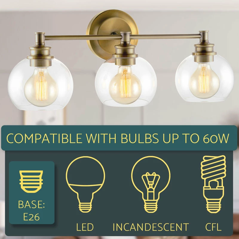 - DECORATIVE STYLE: 3-light vanity features a stunning warm brass finish. Bulbs are housed within a clear glass globe that allows the glow of bright light to shine through. High quality and durable, illuminate your home with this gorgeous, versatile piece