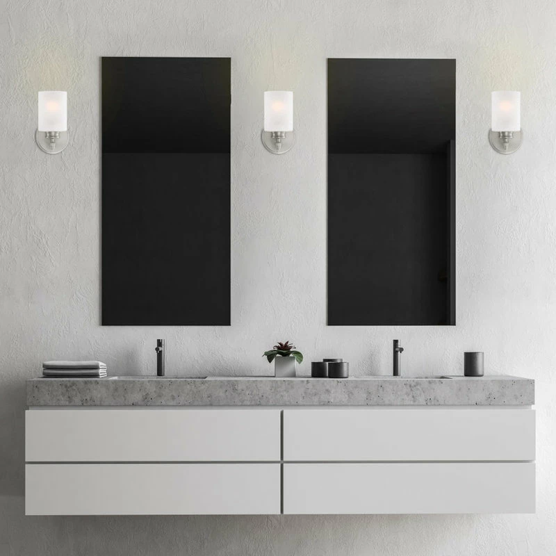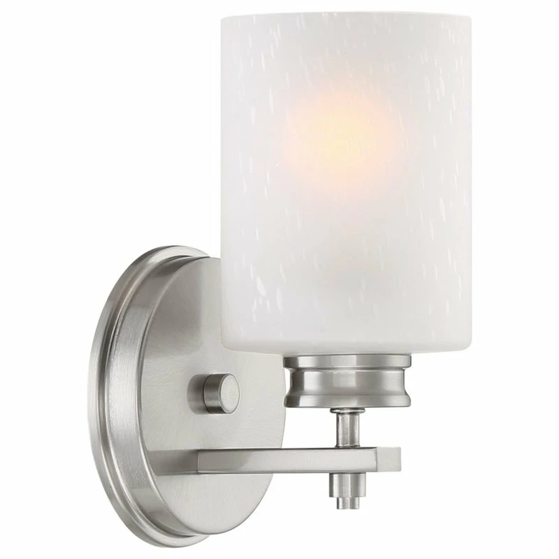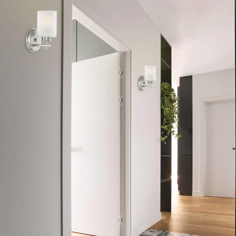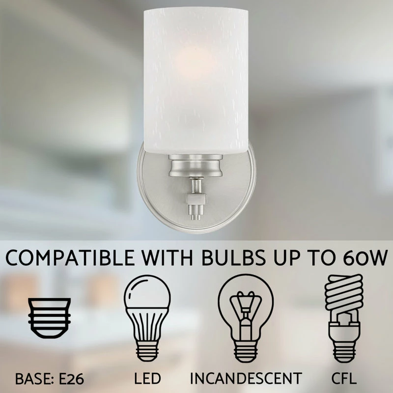 - MINIMALIST STYLE: Simple, elegant bathroom sconce emits a gorgeous glow through cylindrical glass. The frosted, seeded shade sits upon a sleek, brushed nickel frame. Brighten any area with its versatile ability to hang facing in an up or down direction