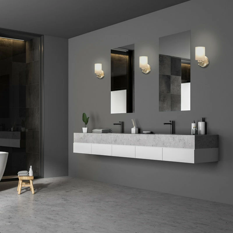 Indoor/Outdoor Usage: IndoorLighting Direction: Up/Down LightLighting Source Type: Incandescent, LED, CFLMounting Style: WallSafety Rating: UL ListedLocation Rating: DampShade Shape: CylinderShade Material: GlassFinish Type: BrushedRecommended Room Type: Indoor, Home, Bathroom, Bedroom, Living Room, Bedroom, Kitchen, Office, Foyer, Entry, Hall, StairsSpecial Feature: Dimmer Compatible