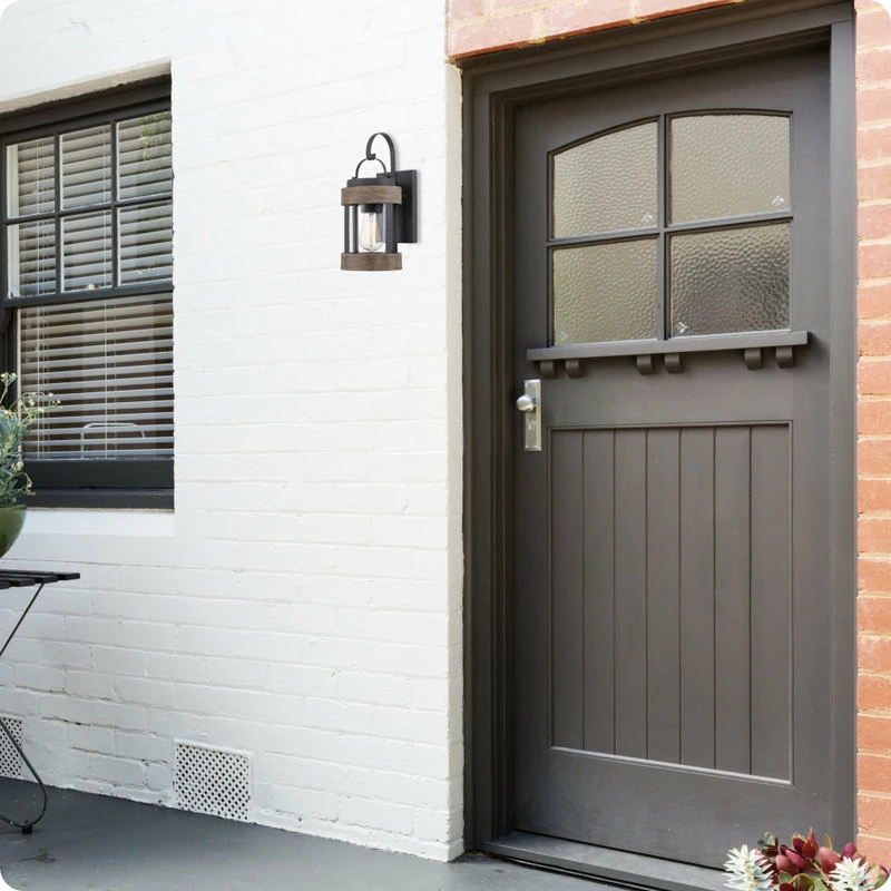 - SLEEK LOOK: Beautiful modern porch light features a decorative scroll style, glass cylinder shade and a textured black finish with rich, weathered oak style accents. Versatile indoor outdoor light fits styles like minimalist, industrial and contemporary