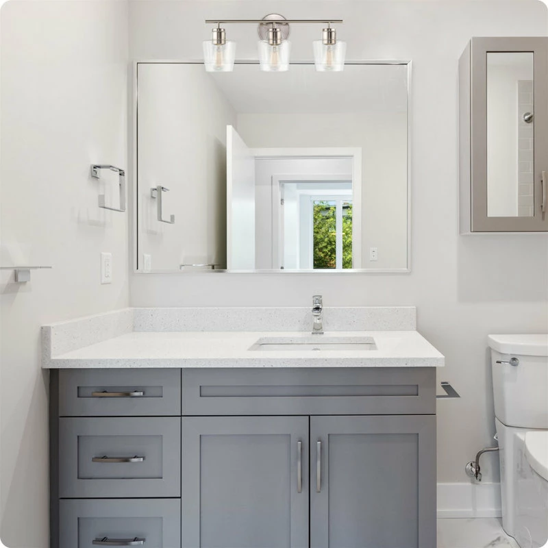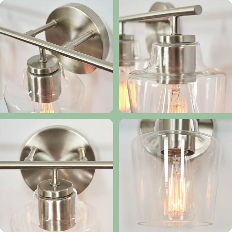 - LUXURIOUS FEEL: Gorgeous vanity wall light showcases a stunning minimal design in brushed nickel finish and clear wine glass shades that make a statement with its sleek curves. Easily installs up or down and fits styles including chic, modern & farmhouse