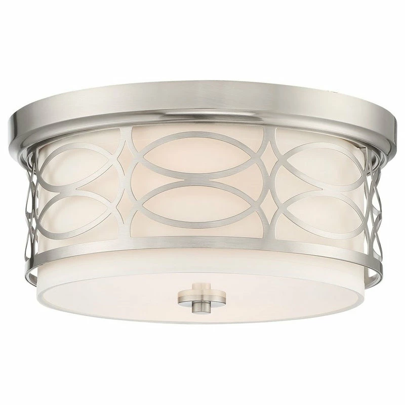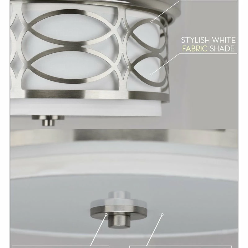 INTRICATE LATTICE DESIGN: Classy close-to-ceiling light features a unique metal drum shade complemented by a stylish white fabric shade and sleek brushed nickel finish. Its tempered glass diffuser casts a soft illumination in any area of your home