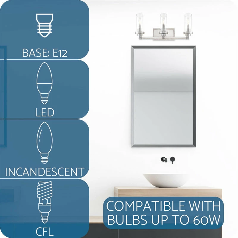 - UL LISTED FOR YOUR SAFETY: UL listed for damp locations. Uses (3) LED, CFL or up to 60W Type B incandescent candelabra base bulbs. Use with vintage style Edison bulbs to encompass that extra farmhouse vibe. Bulbs sold separately