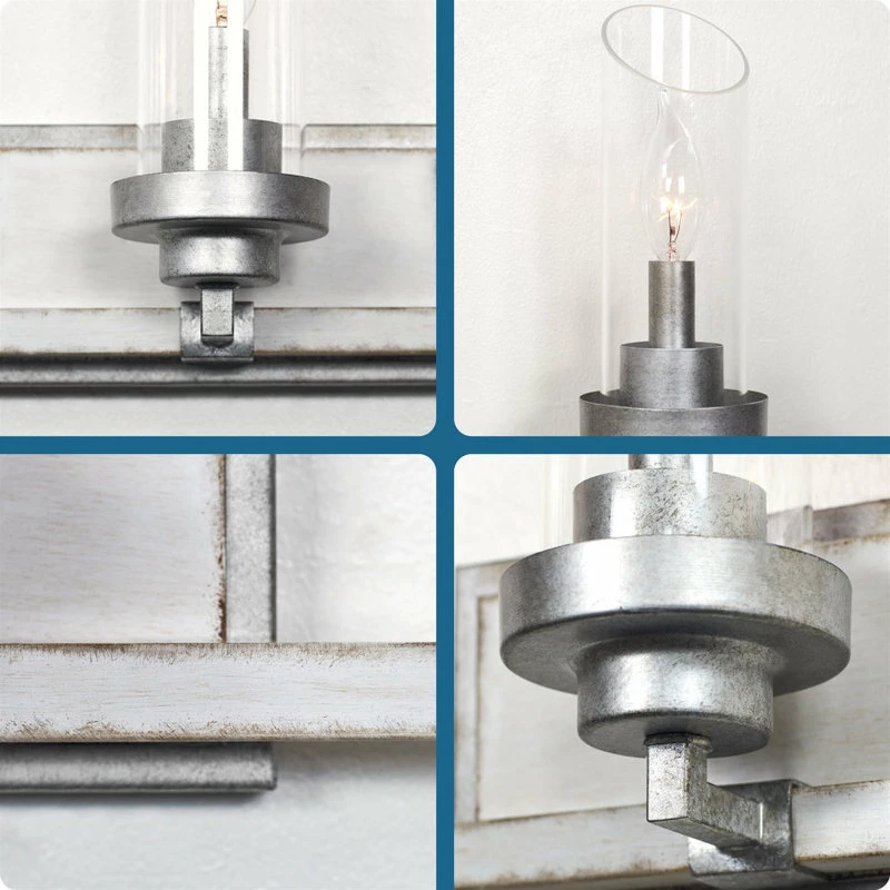 - MODERN STYLE: Stunning galvanized steel vanity light features a complementary white ash style backing and perfectly paired clear, angled cylinder glass shades. Allow this bright linear bathroom light to elevate your home while fitting multiple styles