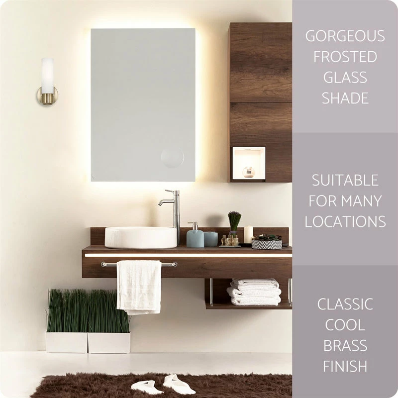 - UNIQUE, MODERN STYLE: Easy-to-install 1-light saber style wall sconce features a sleek cool brass and a tapered, open-ended frosted glass shade, perfect for diffusing light. Stunning wall light shines the perfect amount of light in any home or business