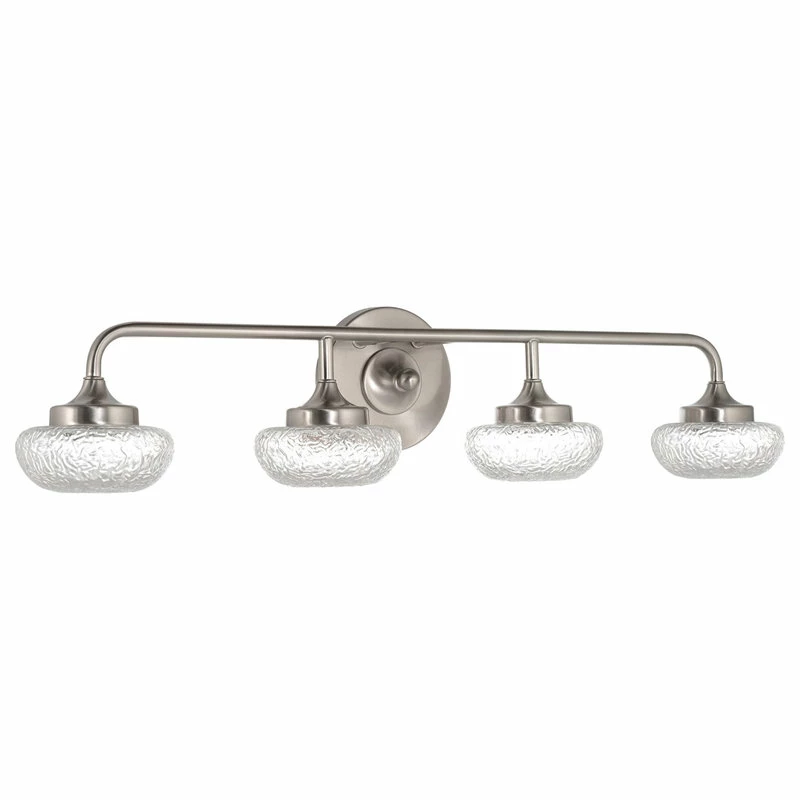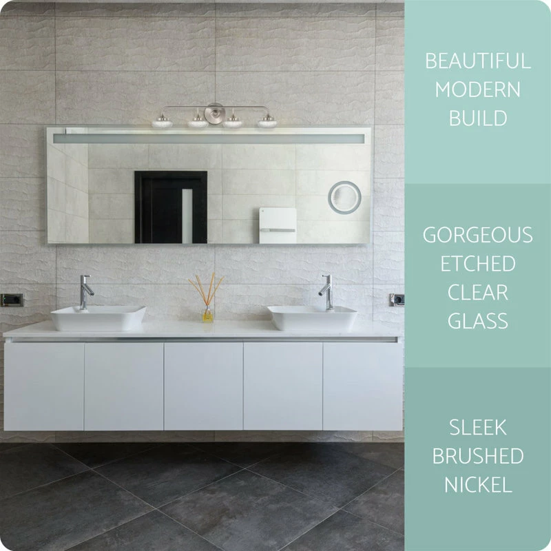 - MODERN DESIGN: Versatile bath bar showcases a classic brushed nickel finish and etched bowl glass shades. Paired with a smooth, stunning LED display and the ability to hang upwards or downwards, this fixture brightens your home without breaking the bank