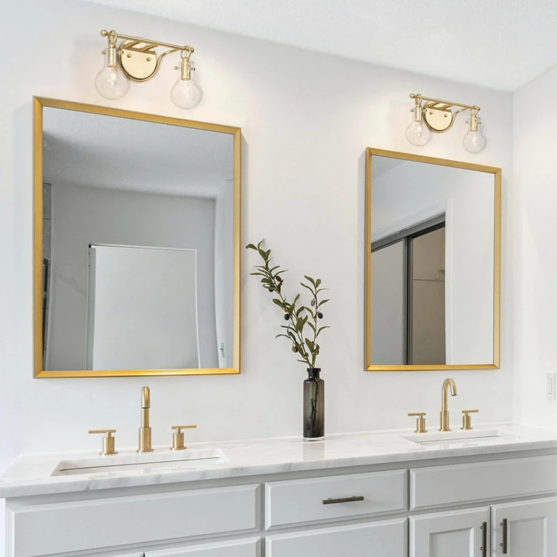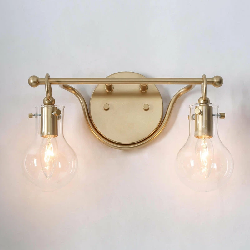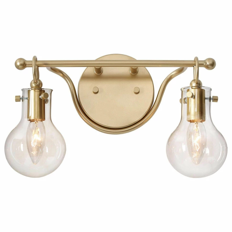 GOLD VANITY LIGHT FIXTURE: Features a fancy gold finish paired with clear glass shades. These elegant, unique curved neck stems from the fixture to the plate, while a stunning light radiates warmth that will brighten your home.