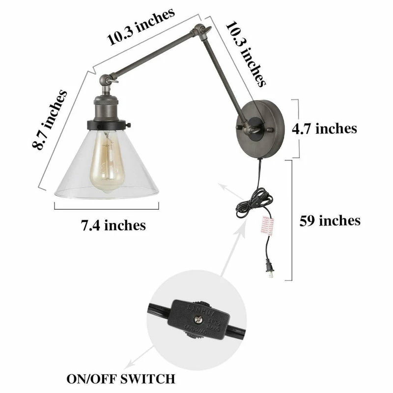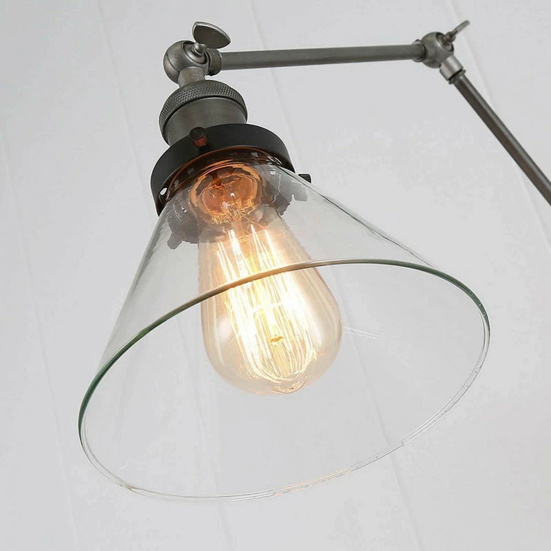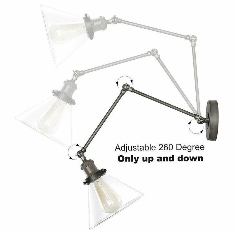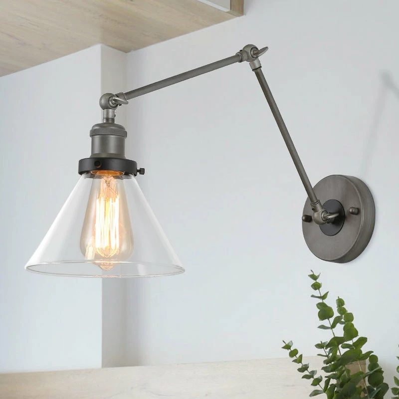 This adjustable wall lamp integrates the ambiance of small shops, nostalgic bars, and romantic cafes to personalized indoor decoration. Its transitional, vintage style is a perfect wall decoration even when not lit up. Once turned on, this lamp issues a soft light through a conical glass shade that fills the room with a warm, inviting atmosphere. The light, adjustable arm adds delicacy and convenience for indoor lighting.