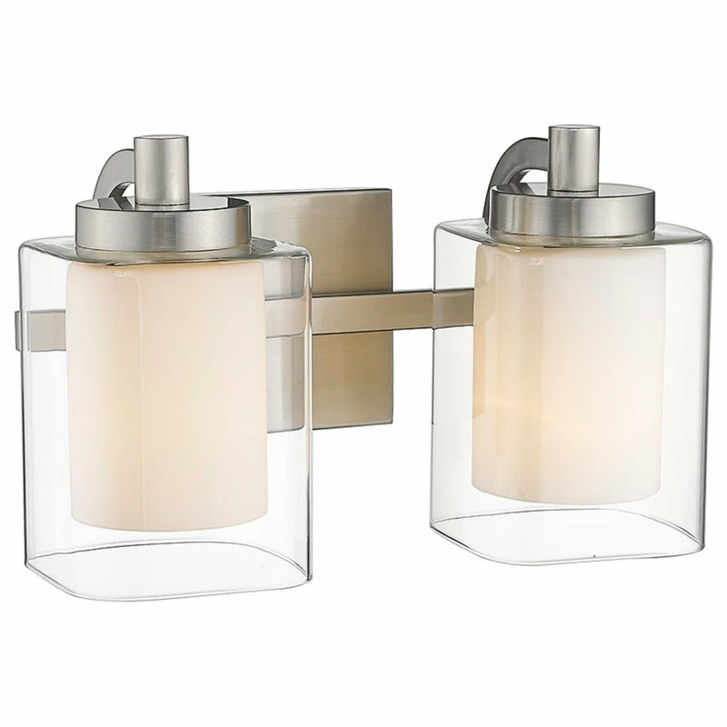 Clean lines and a sleek satin finish make this double glass vanity a splash of modern style, providing just the right amount of light to your powder room. Its rectangular backplate and angular arm give it a contemporary feel, while frosted cylindrical interior glass shades and clear square exterior glass shades create a layered vibe. 2 -100 watts Medium based bulbs (sold separately) and is LED compatible.