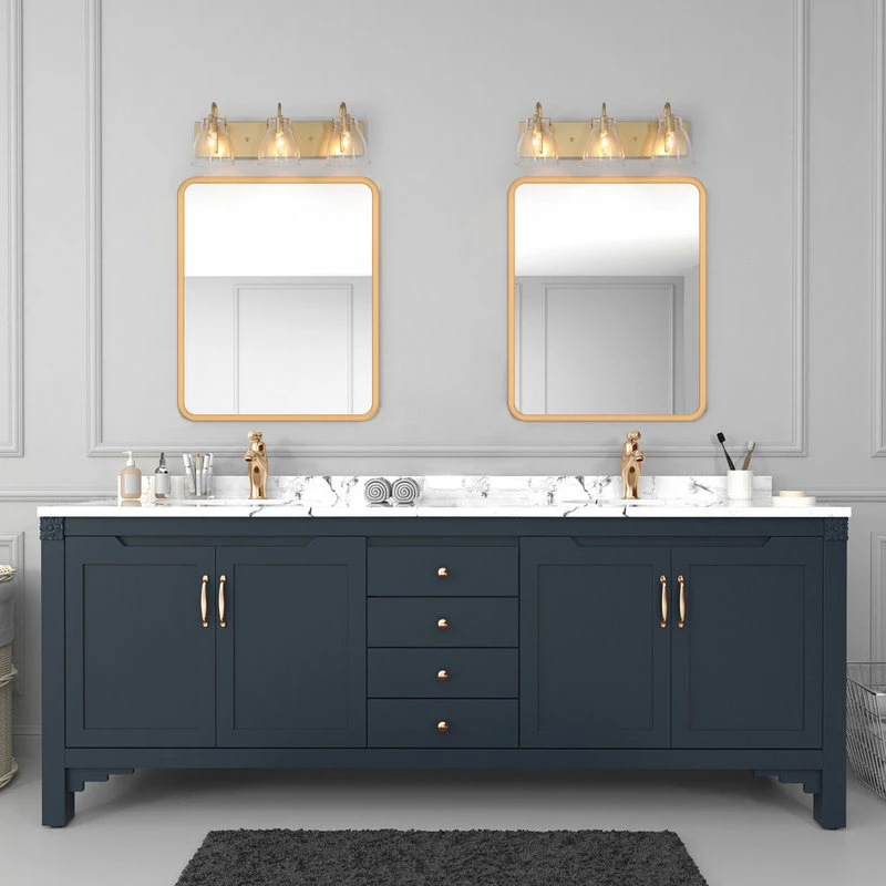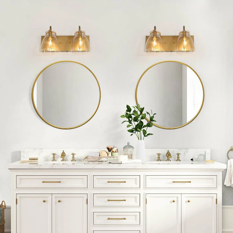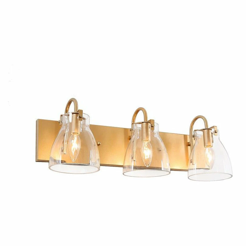Leverage up the style and beauty of your decor with this modern 3-light gold vanity light. Crafted of metal in a stunning gold finish, this modern luminary features a rectangular backplate and slim bar to create a sleek and contemporary look. A trio of glass globe shades supports three bulbs to cast an ambient glow as you tackle your morning and night routines. Install it with the lights pointing up or down to suit your tastes. Plus, we recommend using an E12 regular incandescent bulb or a small round bulb-like E12 Type-B for the globe shade is a little bit small.