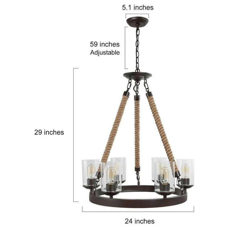 This 6-Light farmhouse wagon wheel chandelier to complete display rustic and eclectic style of your home with this rope collection. It features a bronze framed fixture with rope wrapped arms. The fixture is painted in a dark bronze finish, and complimented with a clear cylinder glass. Clean spherical iron frame gives this collection the status of an instant classic. Using with Edison filament bulbs to convey the retro visual.