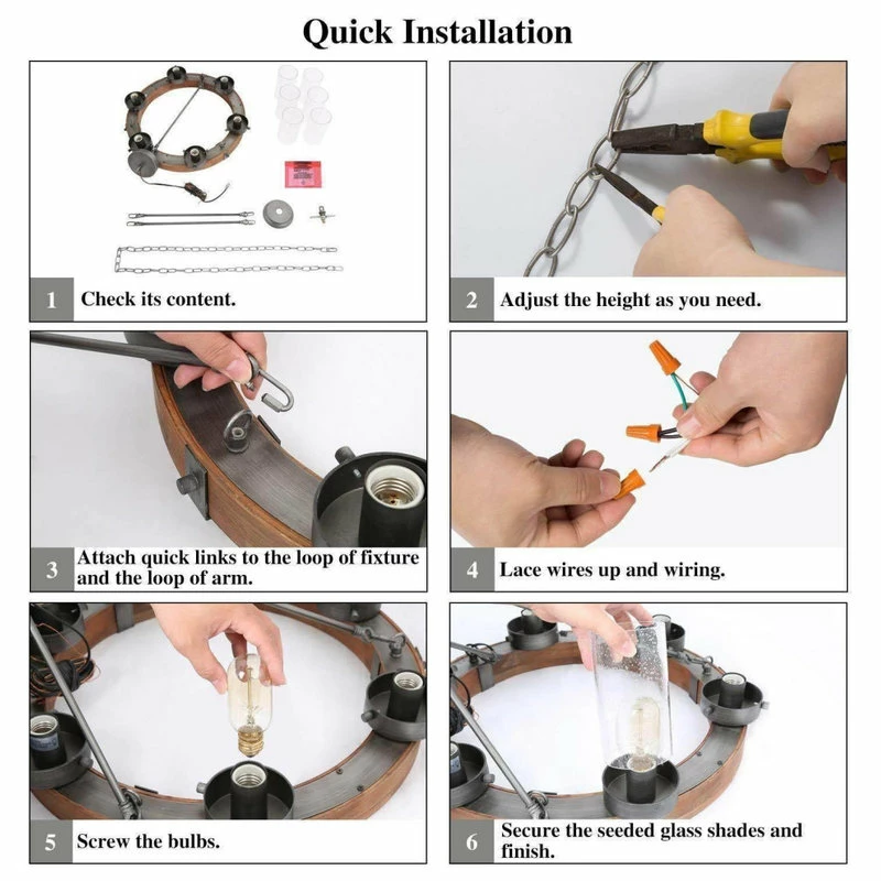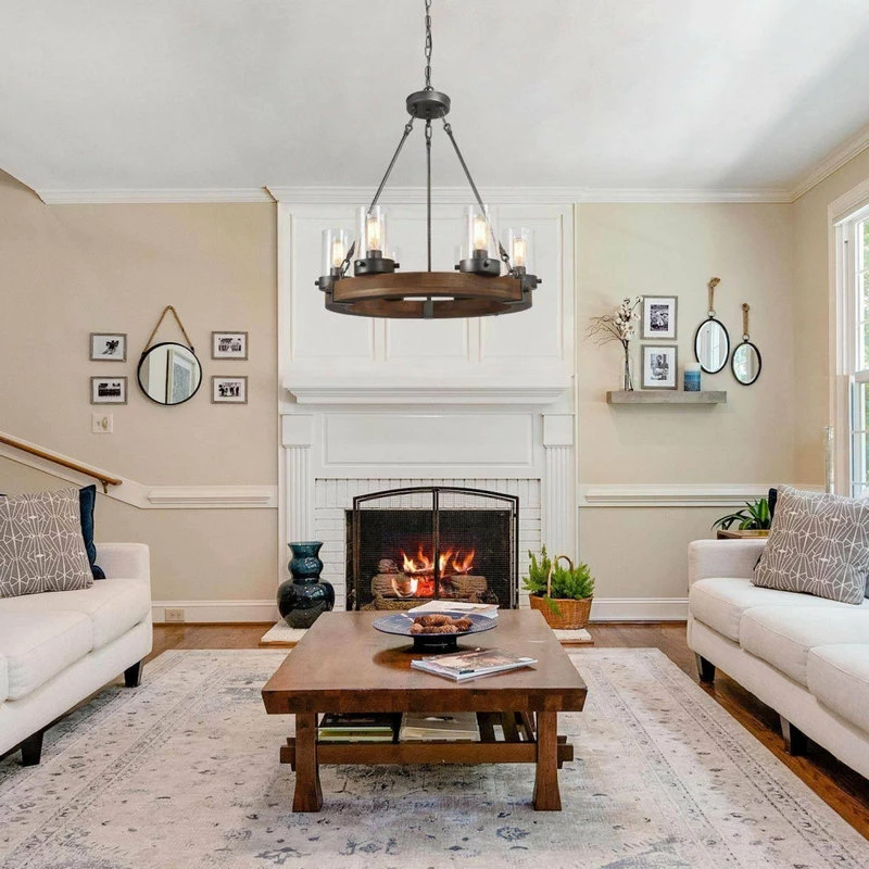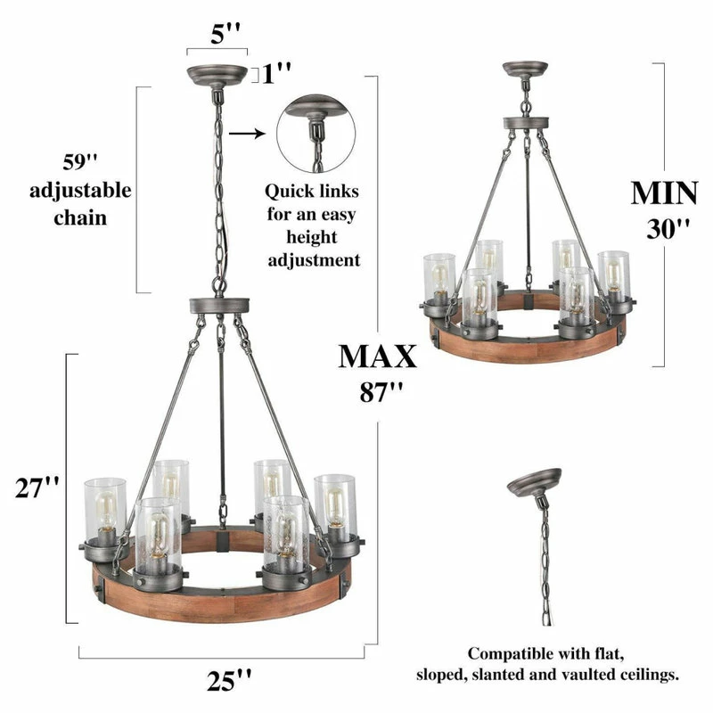 The 6-Light wood chandelier will lend a modern farmhouse charm to your decor. This beautiful six-light transitional chandelier has a wood ring frame, which creates the warm, inviting feel of this open and airy.Transitional Chandelier: it has a wood circular base with cylinder glass shades offering a refined appeal. Delicately hand crafted by skilled artisans, This farmhouse chandelier features a beautifully detailed design. The antique silver finish adds to the beauty.