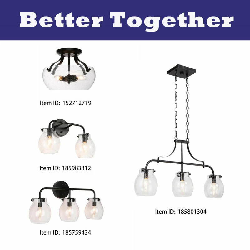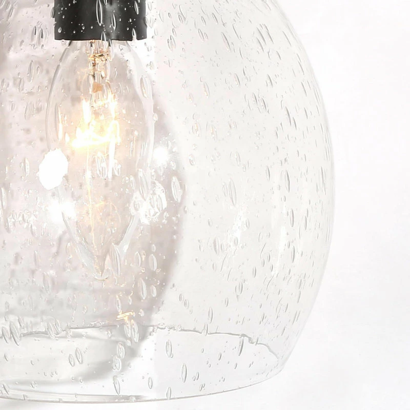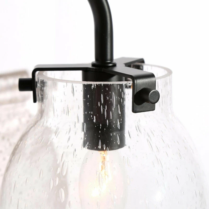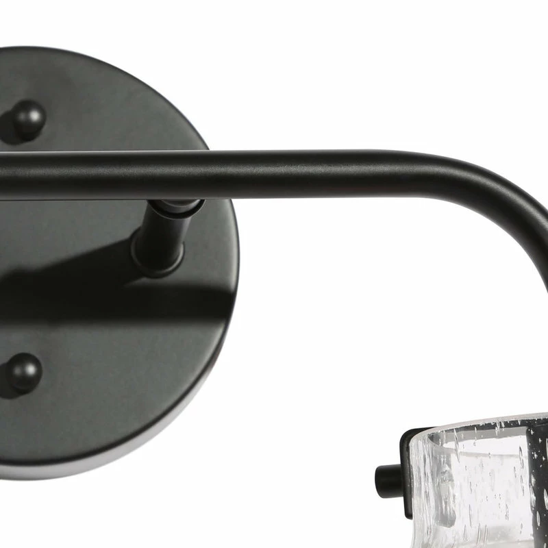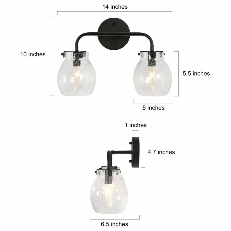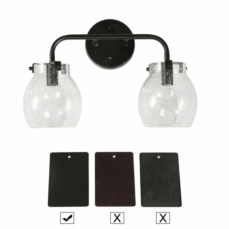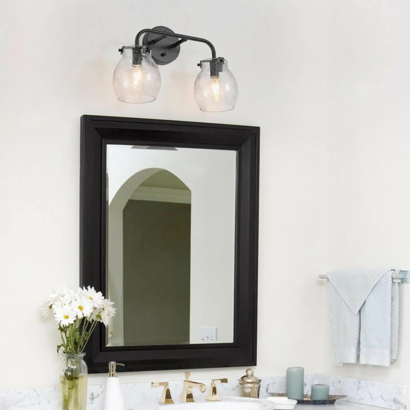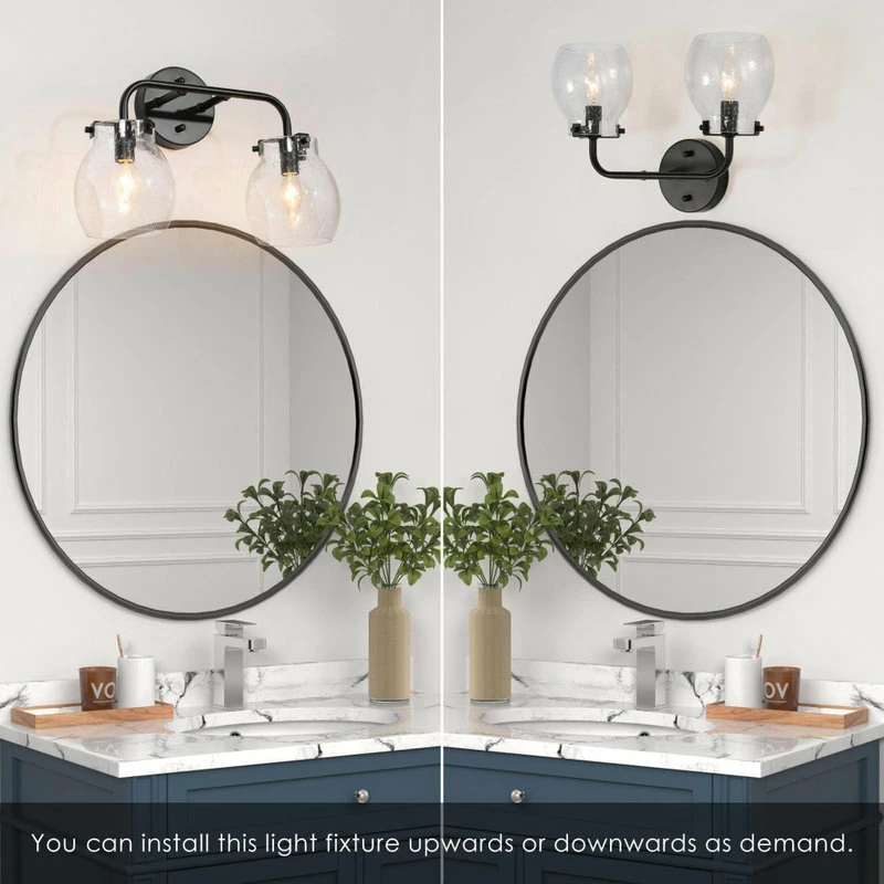 With a black circle backplate and minimalist linear arm, this 2-Light black bathroom vanity light from LNC cannot just add a touch of contemporary industrial style, but this wall lamp features 2 globe clear seeded glass shades with open bottoms creating the coastal farmhouse look in your space. These fixtures are built with a protective matte black finish over durable steel construction to look great and last for years to come. The clear seeded glass shade adds style and warm light, they install easily in the up or down position. Housing two 40-Watt bulbs (not included) gives off a warm, relaxing glow throughout your space. This light is designed for easy installation in damp locations such as bathrooms, powder rooms or other places.