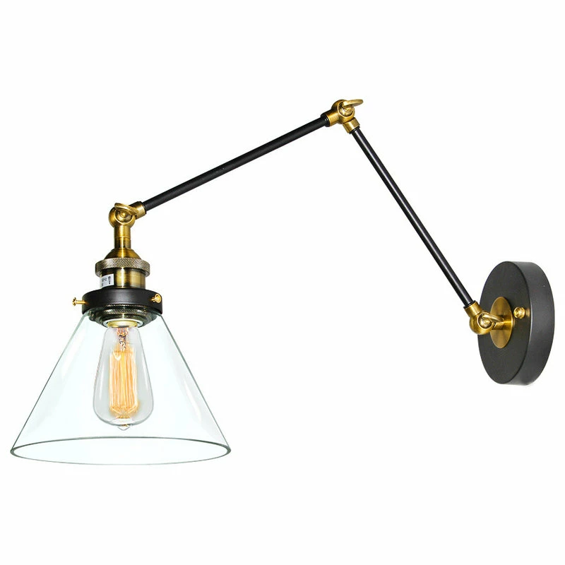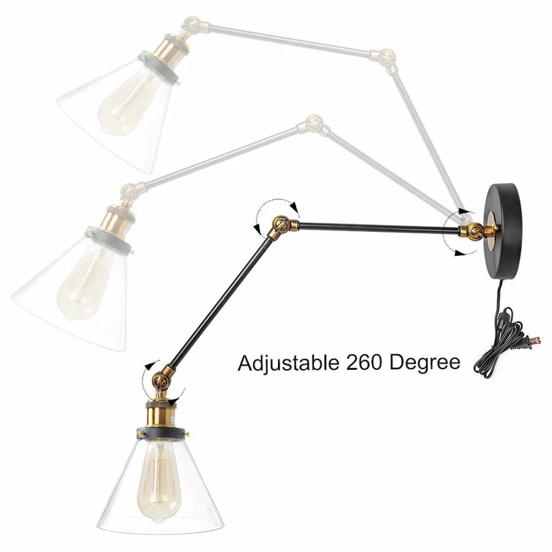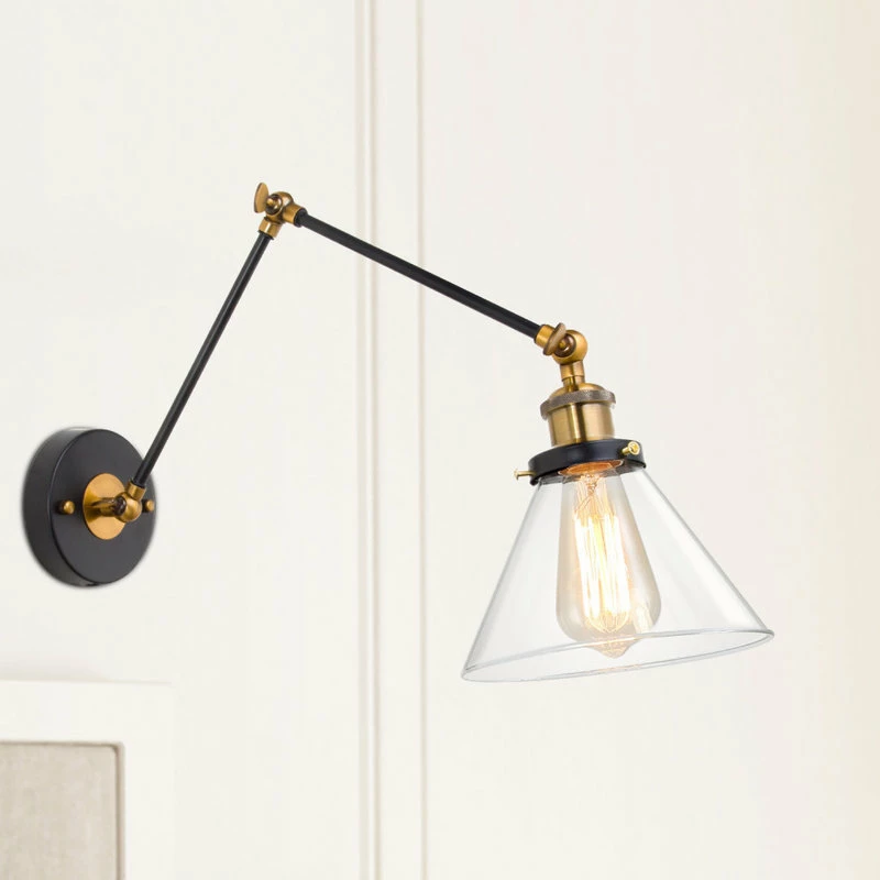 This adjustable swing arm lamp integrates the ambiance of small shops, nostalgic bars, and romantic cafes to personalized indoor decoration. Its sleek modern style is a perfect wall decoration even when not lit up. Once turned on, this lamp issues a soft light through a conical glass shade that fills the room with a warm, inviting atmosphere.