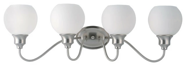 Curved arms support circular glass with an open bottom which can be installed facing up or down. Available in your choice of Polished Chrome with Clear glass or Satin Nickel with Satin White glass.