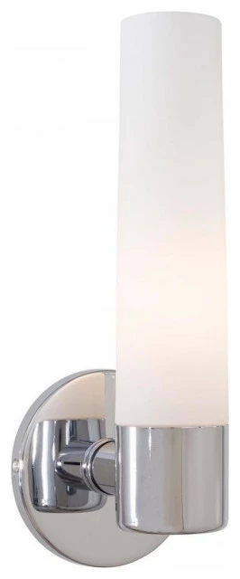 This One Light Bathroom Sconce is part of the Saber Collection and has a Chrome Finish and Case Etched Opal Glass.