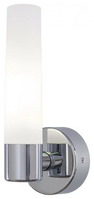 This One Light Bathroom Sconce is part of the Saber Collection and has a Chrome Finish and Cased Etched Opal Glass.