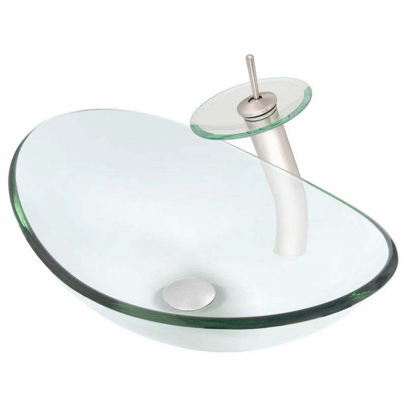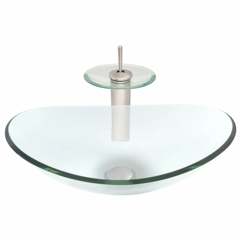 Harmonize and upgrade your bath with Novatto’s clear glass vessel and matching brushed nickel waterfall faucet. Novatto uses advanced technology, including computerized glass processing and Italian furnaces, giving our glass basins unmatched structural integrity. This vessel sink and faucet combo is a great way to harmonize the decor by unifying color and textural design of the bathroom. The matching faucet disc directs the water flow into a graceful waterfall. Each glass sink and faucet features its own beauty of color, structural character and texture adding a sense of purity, elegance and distinctive look to any design.