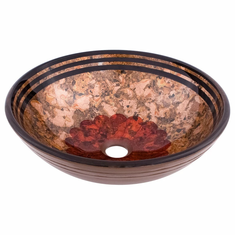 Tappezzeria, from the exclusive hand painted vessel collection of Novatto, adds a touch of style to any bath. Novatto’s tempered glass vessels will enhance and harmonize the look of any bath by unifying color and textural design. Constructed of high tempered glass, this round sink has a unique hand painted design of brown, tan and black. Novatto uses advanced technology, including computerized glass processing, to produce glass basins with unmatched structural integrity and longevity. Tappezzeria has a standard 1.75-inch drain opening. The listing includes a solid brass pop-up drain with oil rubbed bronze finish and a matching mounting ring.