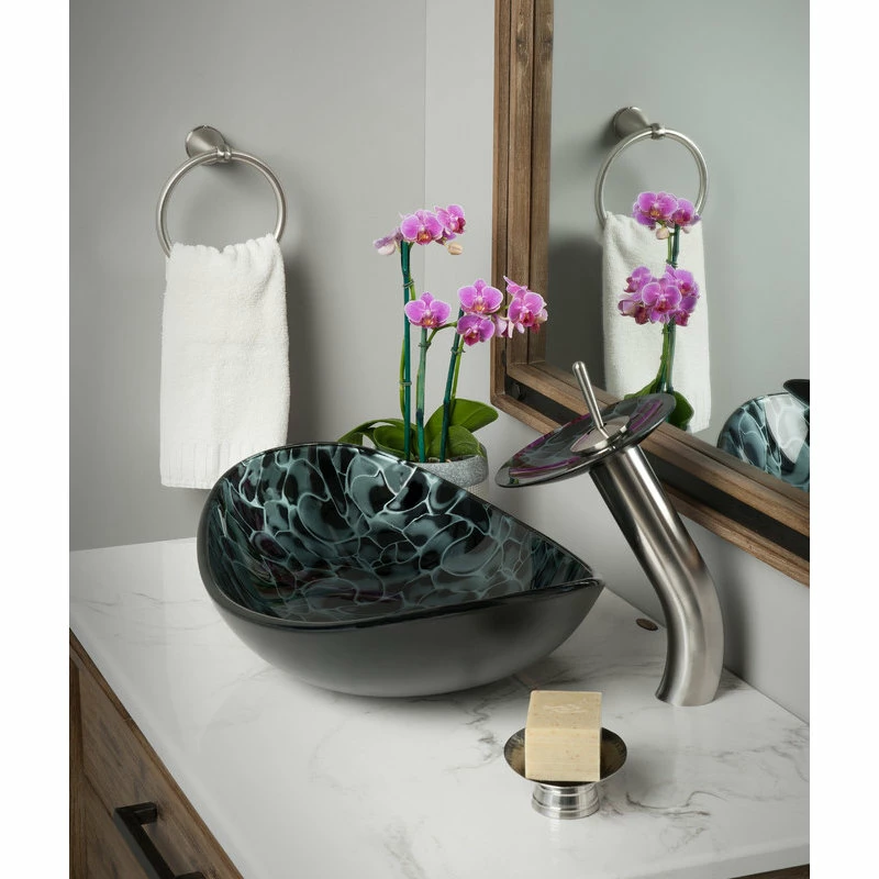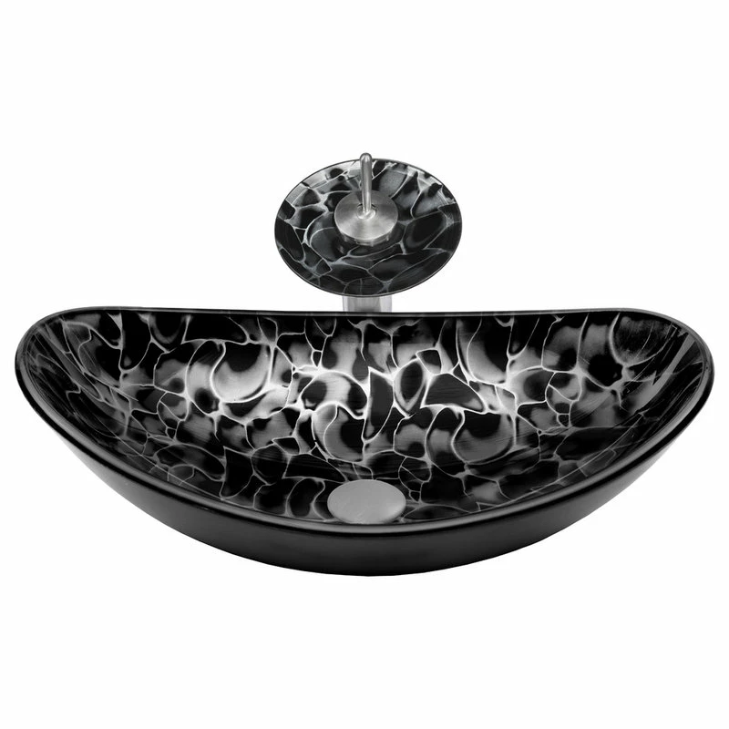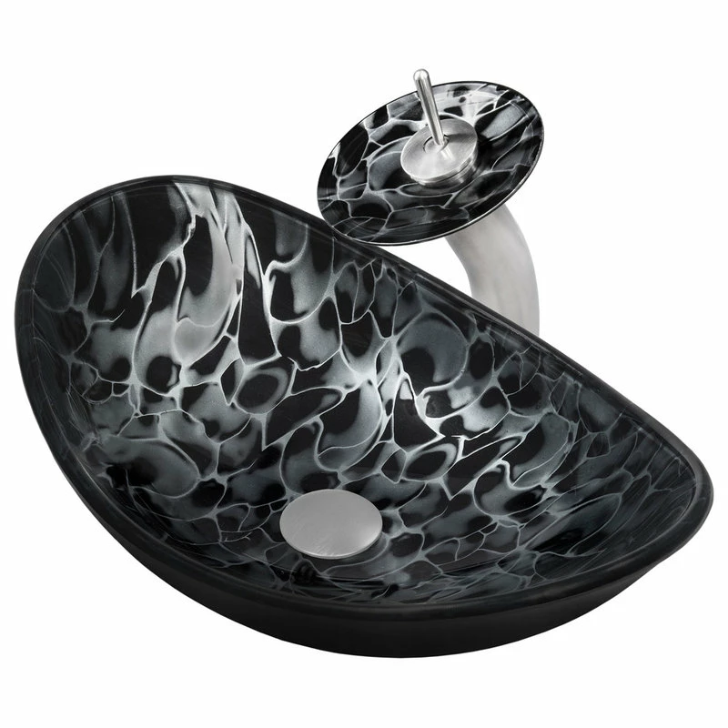 Enhance and harmonize your bath with Novatto’s hand painted glass vessel and matching brushed nickel waterfall faucet. This glass vessel sink features a bold hand-painted tortoise shell design of black and silver. Novatto uses advanced technology, including computerized glass processing and Italian furnaces, giving our glass basins unmatched structural integrity. This vessel sink and faucet combo is a great way to harmonize the decor by unifying color and textural design of the bathroom. The matching faucet disc directs the water flow into a graceful waterfall. When a bath demands superior design and quality, Novatto’s glass vessels add that touch.