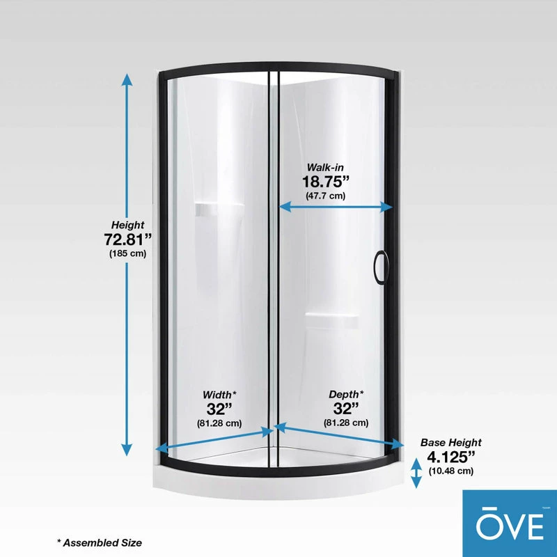 - Kit includes glass panel, glass door, acrylic base, 2-piece acrylic walls, and hardware