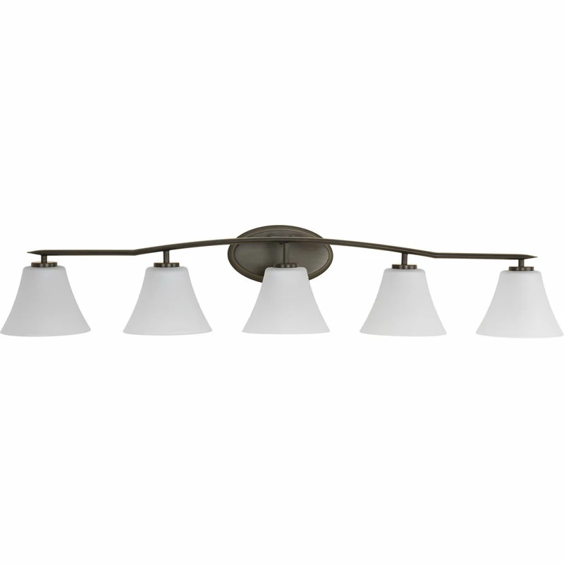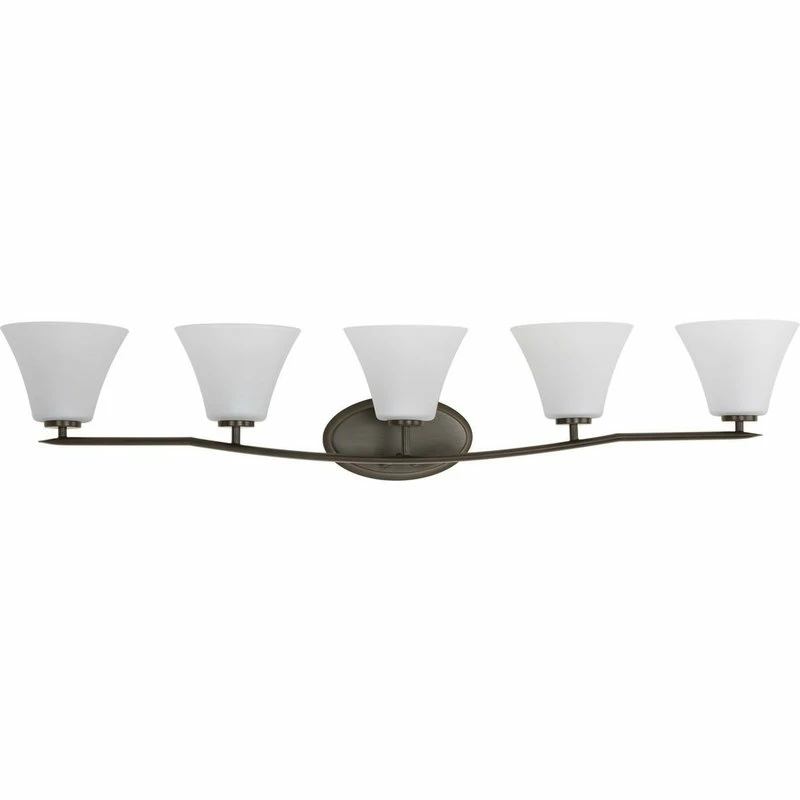 Five-light bath finished in Antique Bronze with etched glass shades scaled across a slightly arching, pointed arm. Generously balanced glass shades add distinction and provide pleasing illumination to your room. Coordinating fixtures from this collection let you decorate an entire home with confidence and style.