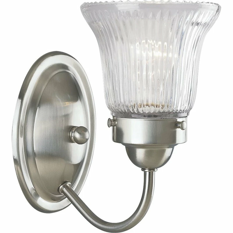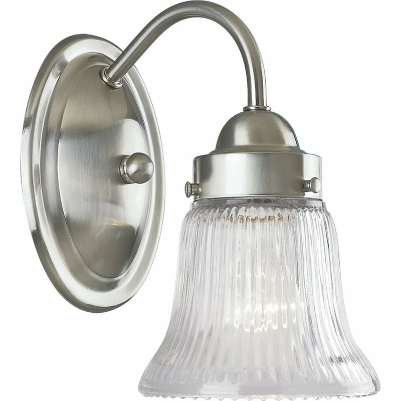 Fluted Glass 1-light bath fixture in a Brushed Nickel finish. Classic metallic fixture is paired with sparkling clear prismatic glass. Timeless in its vintage appeal, this light is stylish for both new and restored homes.