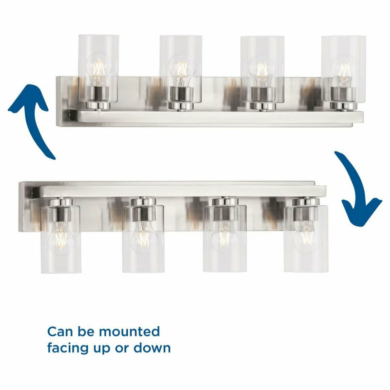 Update any bathroom with the Goodwin Vanity Light, whose clean design seamlessly blends with todays modern decor. Finished in subtle brushed nickel, its crisp lines highlight the modern profile of the rectangular backplate that supports columns of clear glass shades for bright illumination in the bath.This versatile fixture can be mounted with glass facing up or down, casting even illumination in any setting.