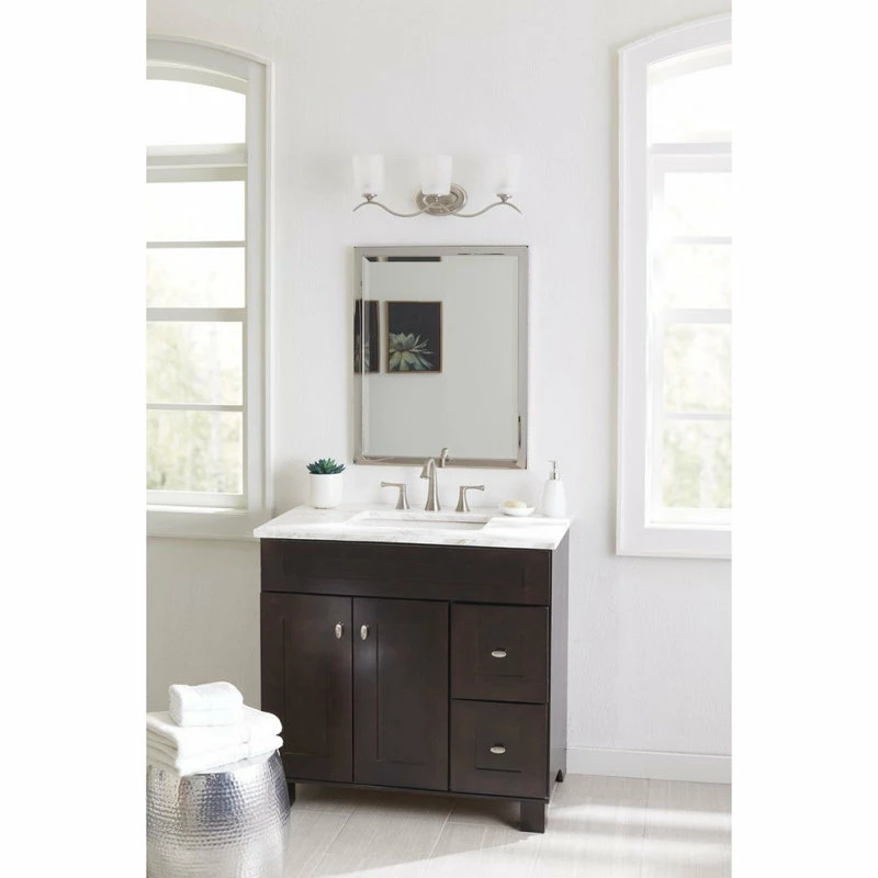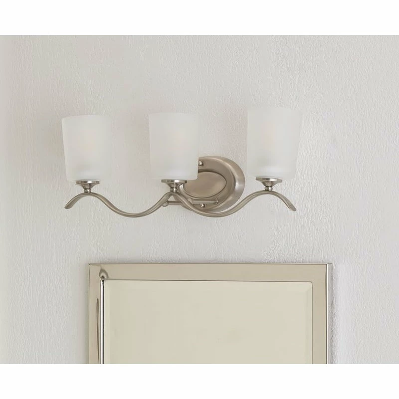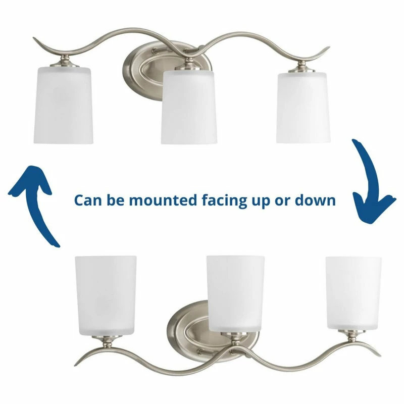 Harkening back to a simpler time, the Inspire Collection freshens traditional forms with flowing lines. Brushed Nickel oval metal arms gracefully breeze over and support etched glass shades. Uniquely designed three-light fixture can create different looks as its versatility allows it to be mounted up or down.