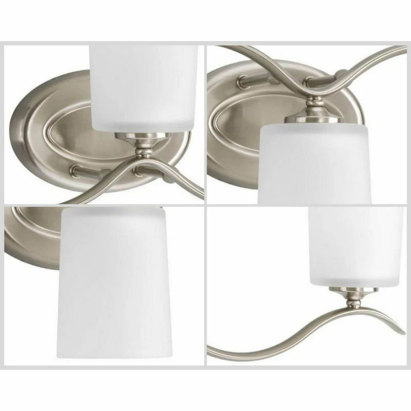- Features: Brushed Nickel finish, Flowing metal arms, White etched glass shades, Versatile design- fixture can be mounted up or down