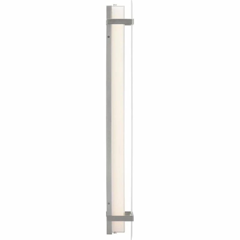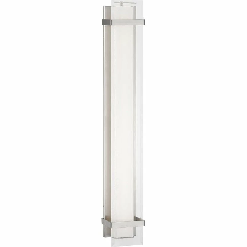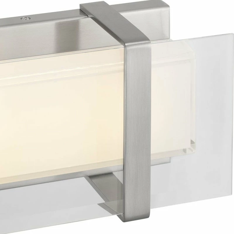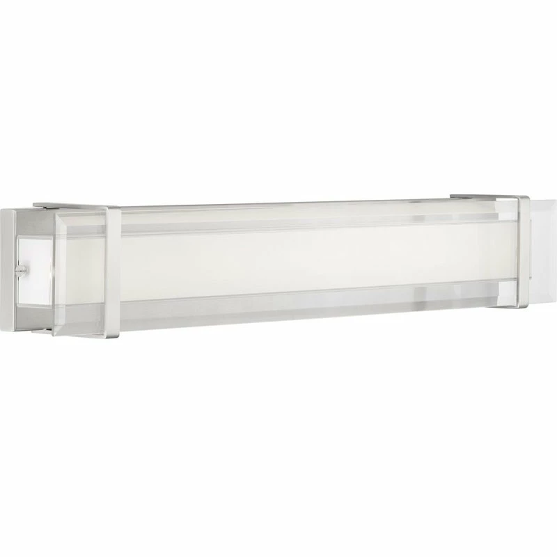 The Miter LED 34in linear bath bar highlights a beautiful layered effect to enhance a variety of interior areas. Each clear beveled glass panel is hand cut and positioned together, creating visual interest that extend to the corners. To complete the form, a back plate and linear accents frame the glass in a Brushed Nickel finish. Can be displayed horizontally or vertically. An integrated LED source provides a variety of energy and cost savings benefits.