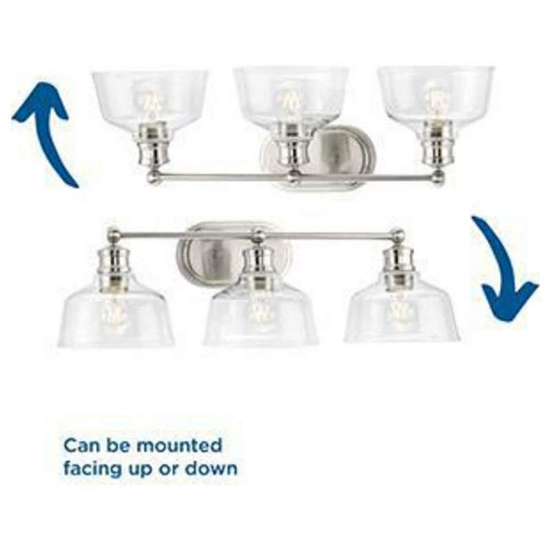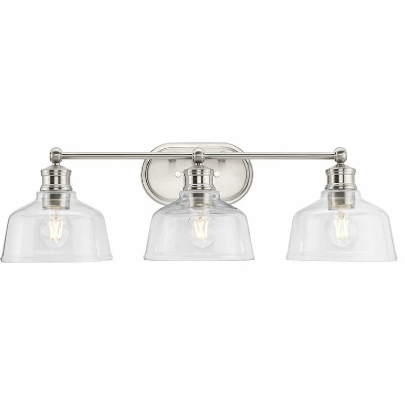 The Singleton Collection 3-light vanity fixture pays homage to industrial styling with oversized warehouse shades fabricated from clear glass. A round backplate and vintage-inspired metal fittings finished in subtle brushed nickel create a timeless design. Place above the vanity mirror for optimal task lighting in the bath. This versatile vanity light can be mounted up or down, casting even illumination in any setting.