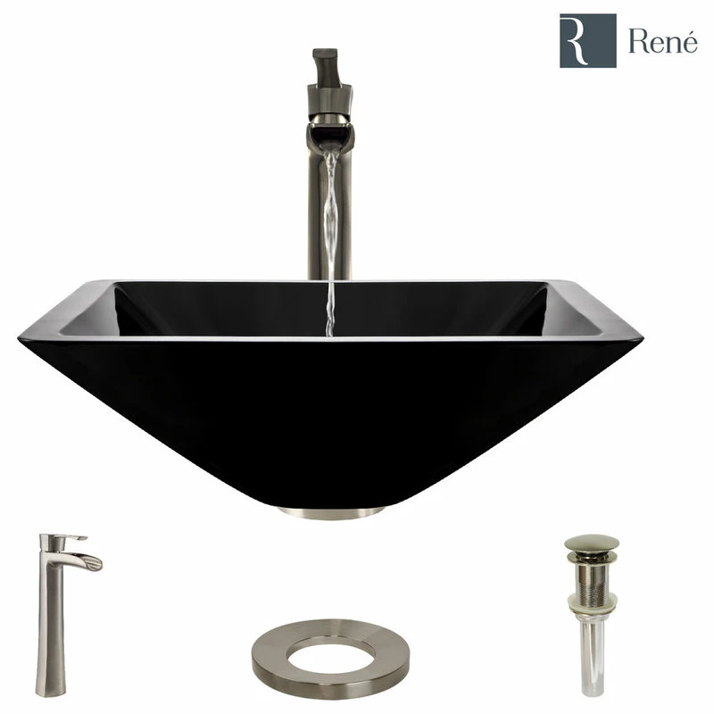 The shimmering elegance of glass is something to behold as this opaque, black-colored vessel rests upon the vanity for all to admire. As with all our glass vessels, the R5-5003-Noir is constructed to be bold and beautiful. Only extra-thick, tempered glass is used in its manufacture. High temperatures will not mar it in any way. Good hygiene comes naturally, as glass is non-porous. Staining or retention of odors is unheard of. Clean up is simple. It measures 16 1/2″ x 16 1/2″ x 6″, and is guaranteed to remain functional and engaging for life. The R9-7007-BN is a tall, vessel-style faucet soundly constructed of premium-quality, solid brass components. Its design is contemporary, but with a nostalgic, water pump spout design in a brushed nickel finish. Water temperature and pressure is controlled by the extended, swivel handle. Ceramic disc cartridges assure dependability. To stabilize this curved basin above the vanity, this brushed nickel sink ring is included. With a simple press to its handsome, brushed nickel dome; the included, spring-loaded, vessel pop-up drain can be opened or closed.