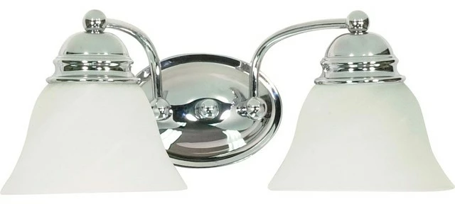 Polished Chrome is accented by Alabaster glass in this vanity collection.