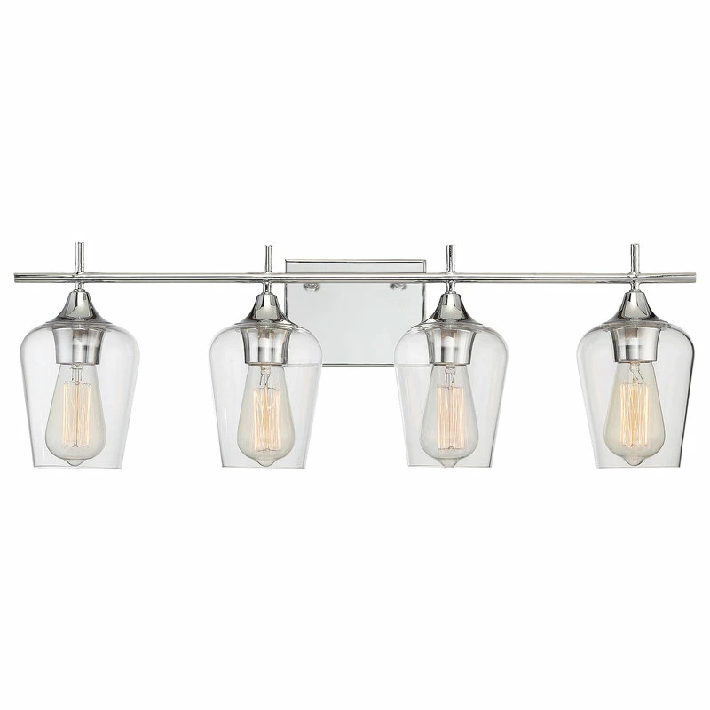 The Octave 4-light bath bar from Savoy House has understated elegance. It features large curved shades of clear glass, minimal detailing and a polished chrome finish. It may be mounted as either uplight or downlight. Bath bar lights are a classic choice for illuminating vanity mirrors in bathrooms big and small. Because the bulbs are exposed, try using stylized bulbs (not included) such as Edison for a different look! The polished chrome finish can be paired with chrome hardware or mixed with hardware in other fixtures. Try the Octave with glam, transitional or contemporary style rooms for a chic look. When you choose a Savoy House lighting fixture, you can be certain you’ve selected a piece that will withstand the test of time.