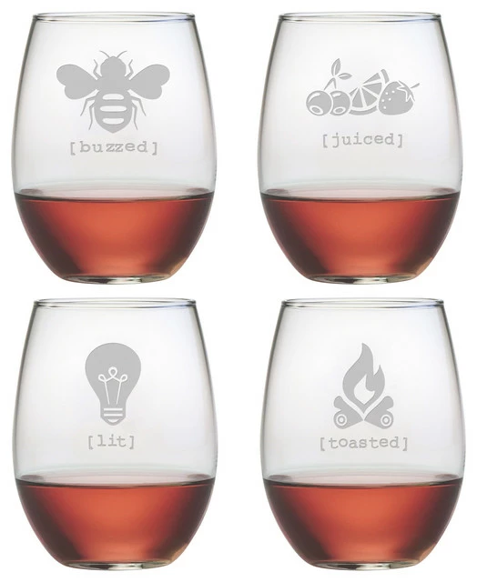 Each 21 ounce stemless tumbler is sand etched with a different synonymously-saucy design, including ‘juiced,’ ‘lit,’ ‘buzzed,’ and ‘toasted.’ Dishwasher safe. Sold as a set of four. Made and decorated in the USA.