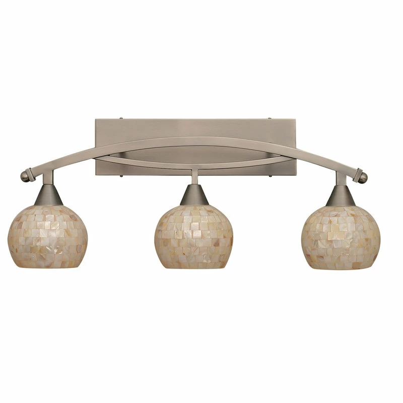 - Bow 3 Light Bath Bar Shown In Brushed Nickel Finish with 6″ Mystic Seashell Glass