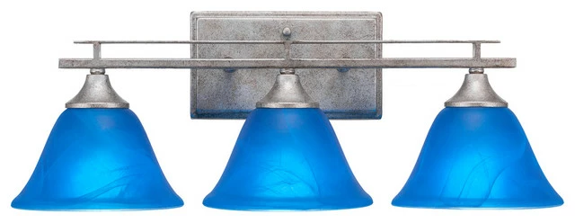- Uptowne 3 Light Bath Bar Shown In Aged Silver Finish With 7″ Blue Italian Glass
