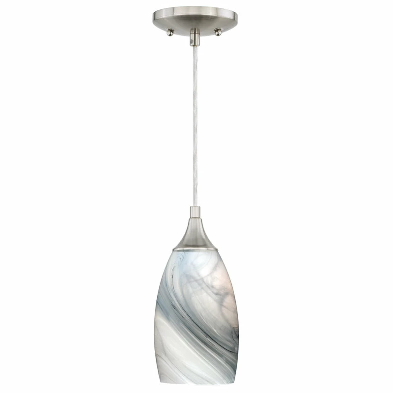 The Milano collection of mini pendant lights feature softly radiused hand-blown glass that gracefully blends into almost any decor. Because each glass is handcrafted utilizing century-old techniques, no two pieces are identical. The marble swirl colored glass has tones of gray and silver and is housed in a satin nickel finish for a contemporary and artistic look. Install this mini pendant individually or in a group; ideal for kitchens, dining areas, or bar areas.