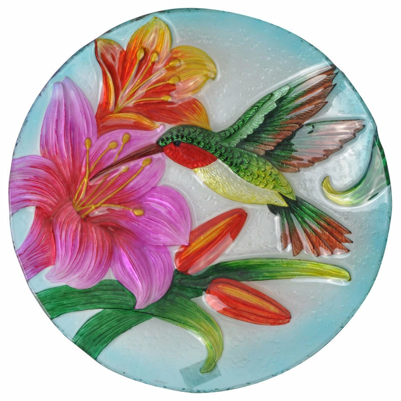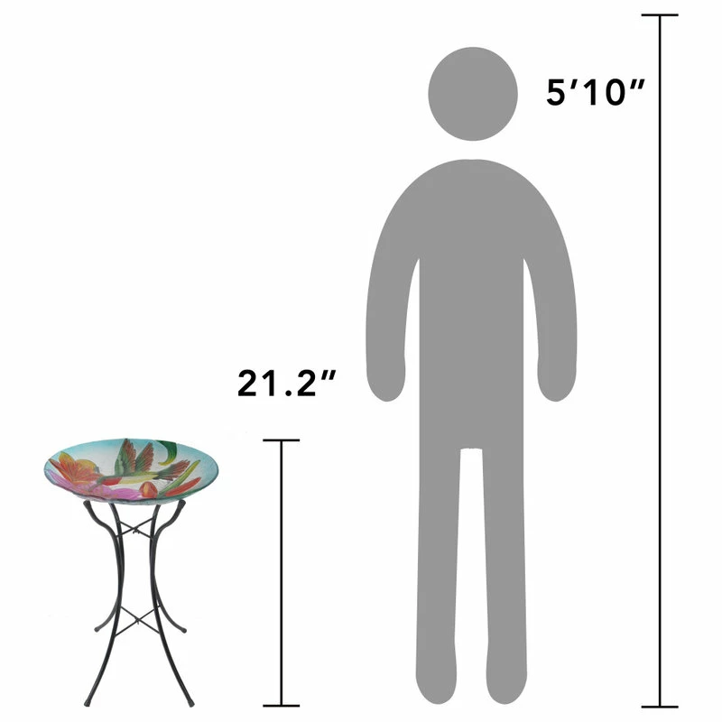 Provide a gathering space in your backyard for your feathered friends with the Peaktop 18″ Outdoor Glass Flower and Hummingbird Birdbath with Stand. This colorful glass birdbath provides a sanctuary for all types of birds while also adding a pop of color to your outdoor living space, yard, or lawn. Featuring a multi-colored design with hummingbirds and flowers, this stylish lawn decoration creates visual interest in your outdoor area. Fill this birdbath with water or with seed to transform it into a colorful feeder. Constructed from sturdy and resilient glass with an included metal stand, the bird bowl is built for years of quality outdoor use. The sturdy metal legs provide stability and prevents tipping when multiple birds gather on the bowl. For easy setup, teardown, and storage when not in use, the metal stand can fold down to a compact size. This hummingbird birdbath is both stylish and functional, and it provides a fun addition to your courtyard, patio, or yard. This compact birdbath measures 18″L x 18″W x 21.2″H to fit almost any outdoor area.