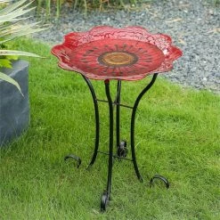 Provide a gathering space in your backyard for your feathered friends with the Peaktop 18″ Outdoor Glass Flower Birdbath with Stand. This colorful glass birdbath provides a sanctuary for all types of birds while also adding a pop of color to your outdoor living space, yard, or lawn. Featuring a multi-colored design with a flower mosaic, this stylish lawn decoration creates visual interest in your outdoor area. Fill this birdbath with water or with seed to transform it into a colorful feeder. Constructed from sturdy and resilient glass with an included metal stand, the bird bowl is built for years of quality outdoor use. The sturdy metal legs provide stability and prevents tipping when multiple birds gather on the bowl. For easy setup, teardown, and storage when not in use, the metal stand can fold down to a compact size. This flower birdbath is both stylish and functional, and it provides a fun addition to your courtyard, patio, or yard. This compact birdbath measures 18″L x 18″W x 21.2″H to fit almost any outdoor area.