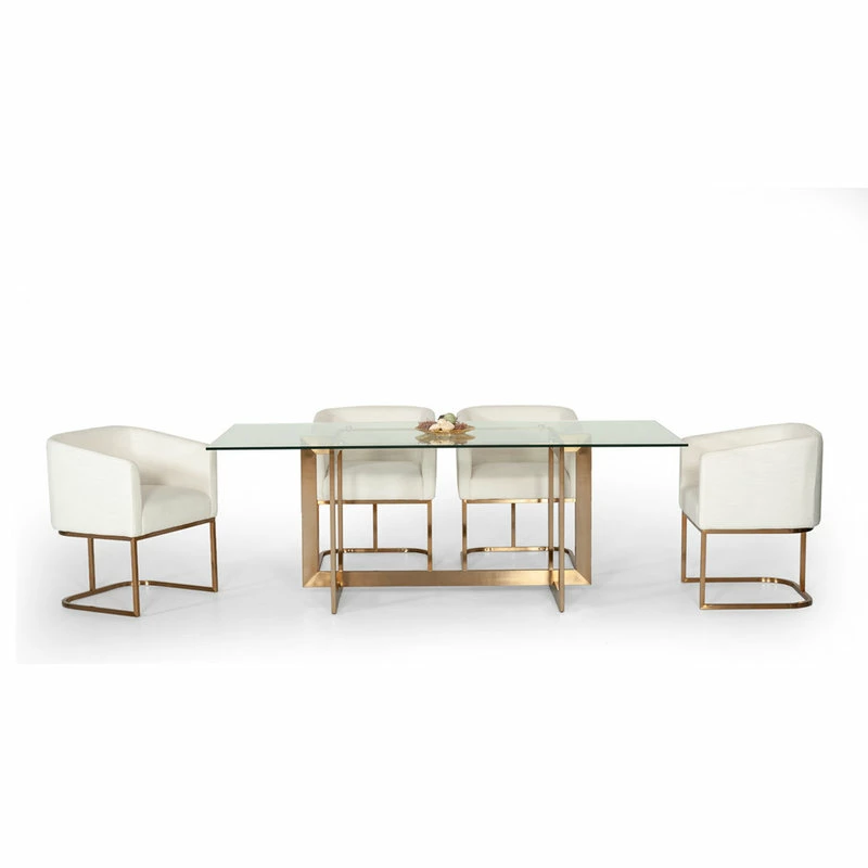 The Modrest Keaton Modern Glass & Brass Dining Table is a picture of charm and gracefulness featuring a rectangular 12mm clear tempered glass top that rests on a sturdy brushed stainless steel frame with lustrous brass finishing. It has a dimension of W79″ x D39″ x H30″ and seats 6 persons comfortably. The Chrysler Buffet included in the picture is available separately.