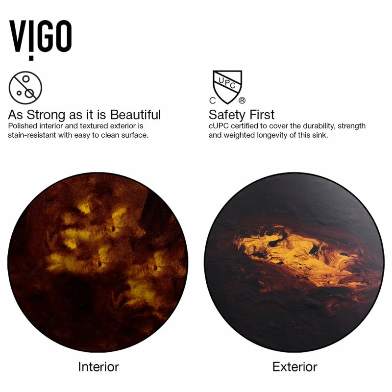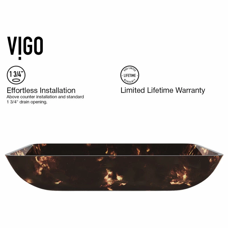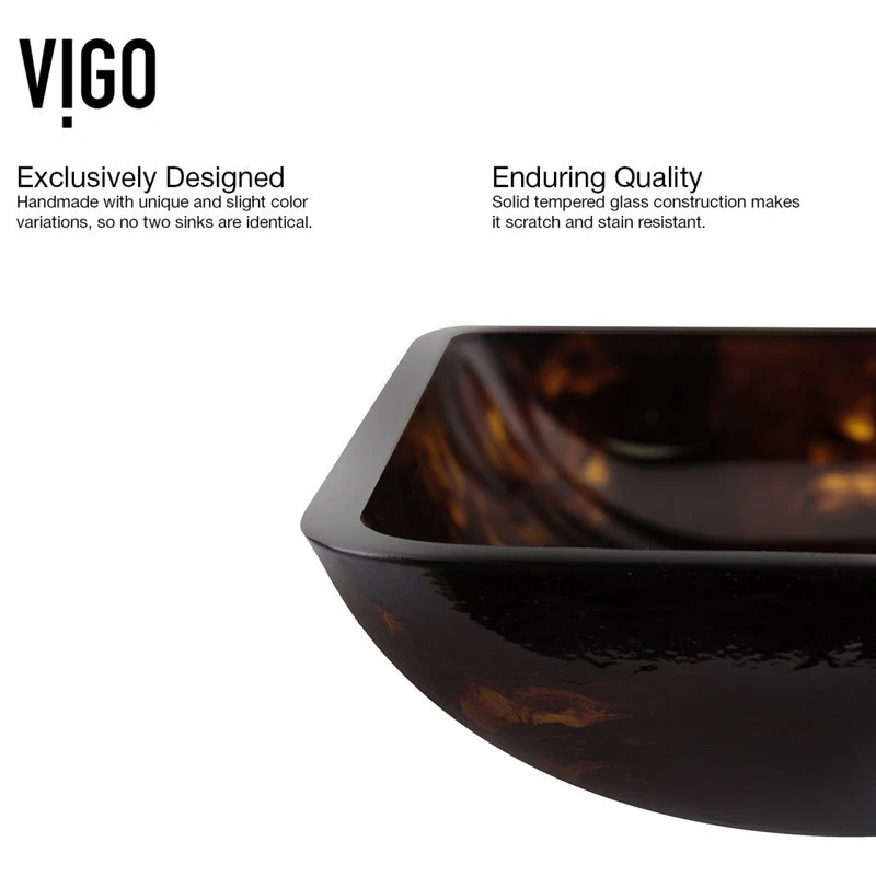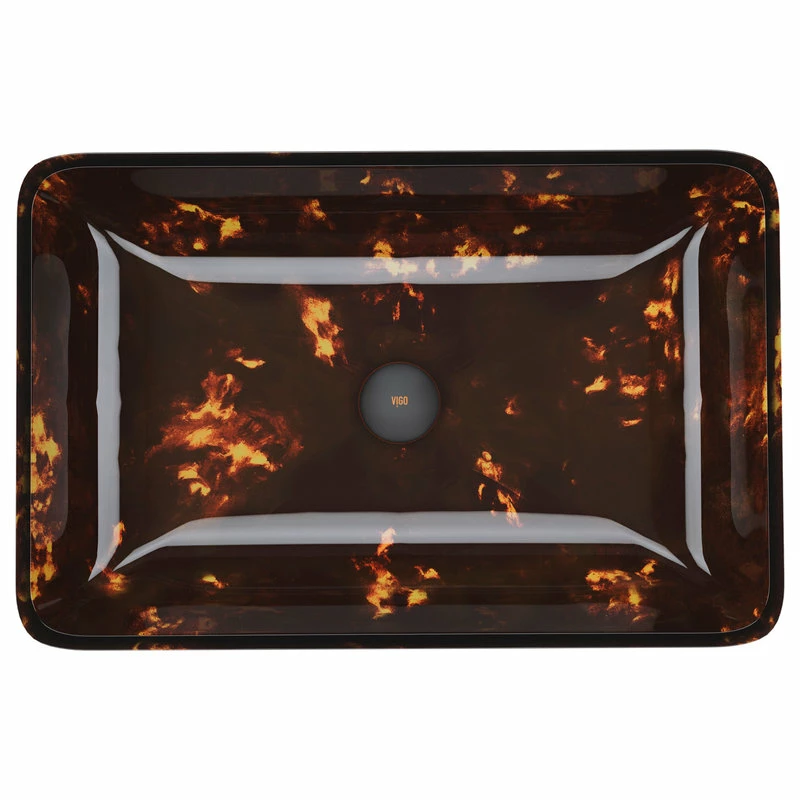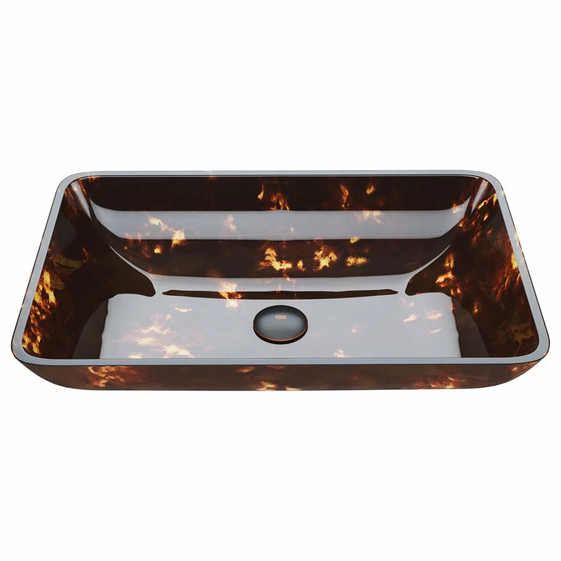 - The Vigo Rectangular Brown and Gold Fusion glass vessel sink features tones of brown and gold, providing a luxurious and elegant design.