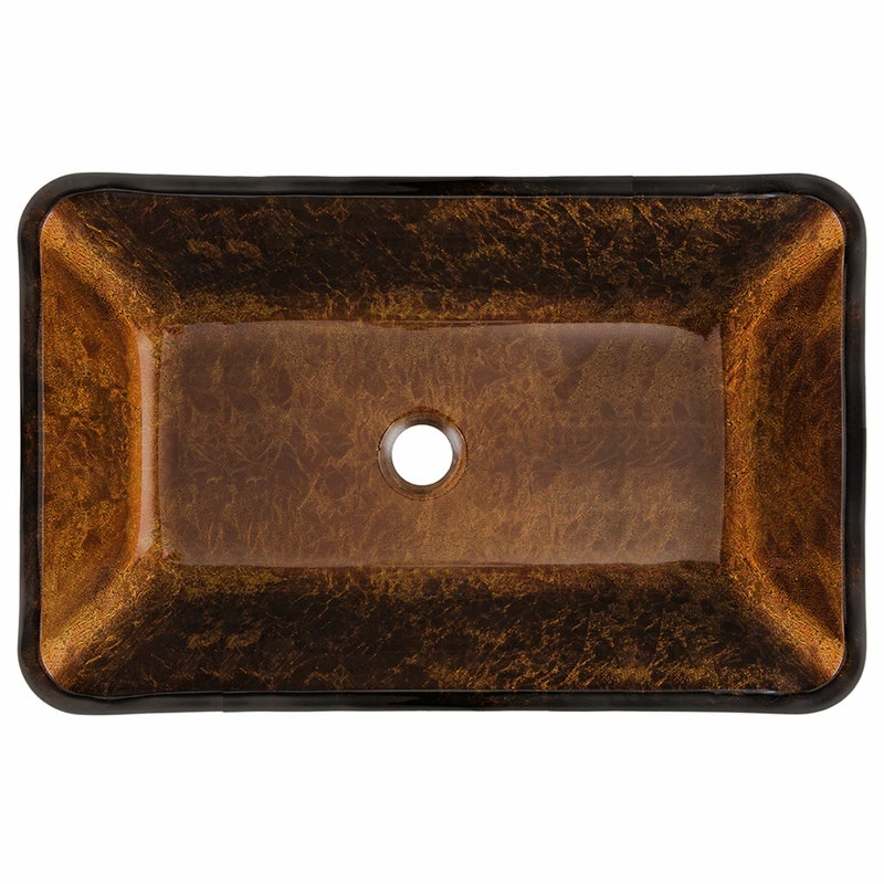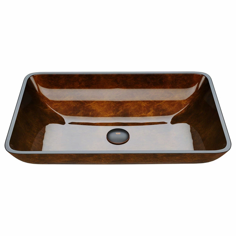 - The Vigo Rectangular Russet glass vessel sink features an elegant blend of brown and amber tones, creating a warm earthy centerpiece for your bath.