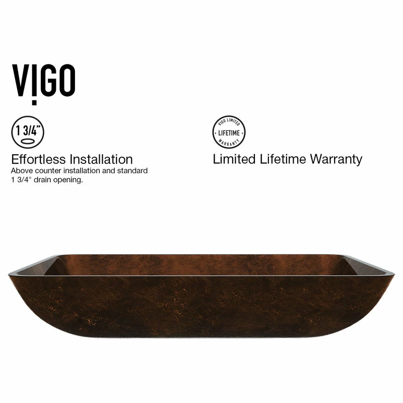 VIGO presents the Russet tempered glass vessel bathroom sink set with Niko single-hole vessel faucet in antique rubbed bronze finish. The vessel sink is made from durable tempered glass. It has a textured, scratch-resistant exterior and a polished interior, making it easy to clean. Its handmade design leaves slight color variations that ensure no two sinks look alike. It pairs perfectly with the Niko vessel bathroom faucet in a matching finish. The faucet operates at a 1.2 GPM flow rate to conserve water. The water volume and temperature are operated by a single lever, making the Niko faucet usage effortless. It includes all mounting hardware, a matching finish pop-up drain, and hot/cold waterlines for hassle-free installation.