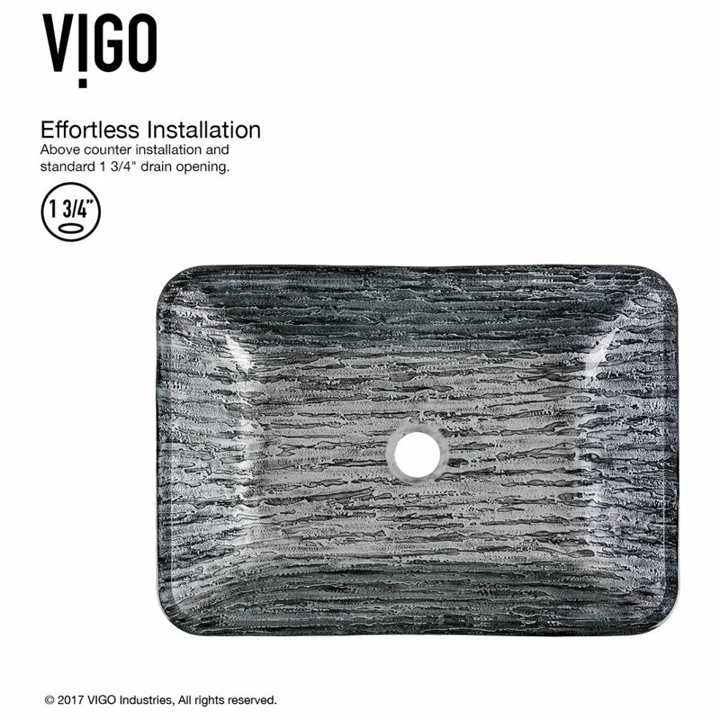 With an organic pattern of black, white and silver streaks, the VIGO Rectangular Titanium Glass Vessel Bathroom Sink makes a spacious, eye-catching addition in any modern bathroom. This handcrafted sink resists staining and scratching over time thanks to its durable solid tempered glass construction. Includes VIGO Niko Vessel Bathroom Faucet in chrome finish, matching finish pop-up drain and optional mounting ring.