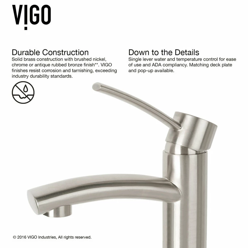 - VIGO finishes resist corrosion and tarnishing, exceeding industry durability standards