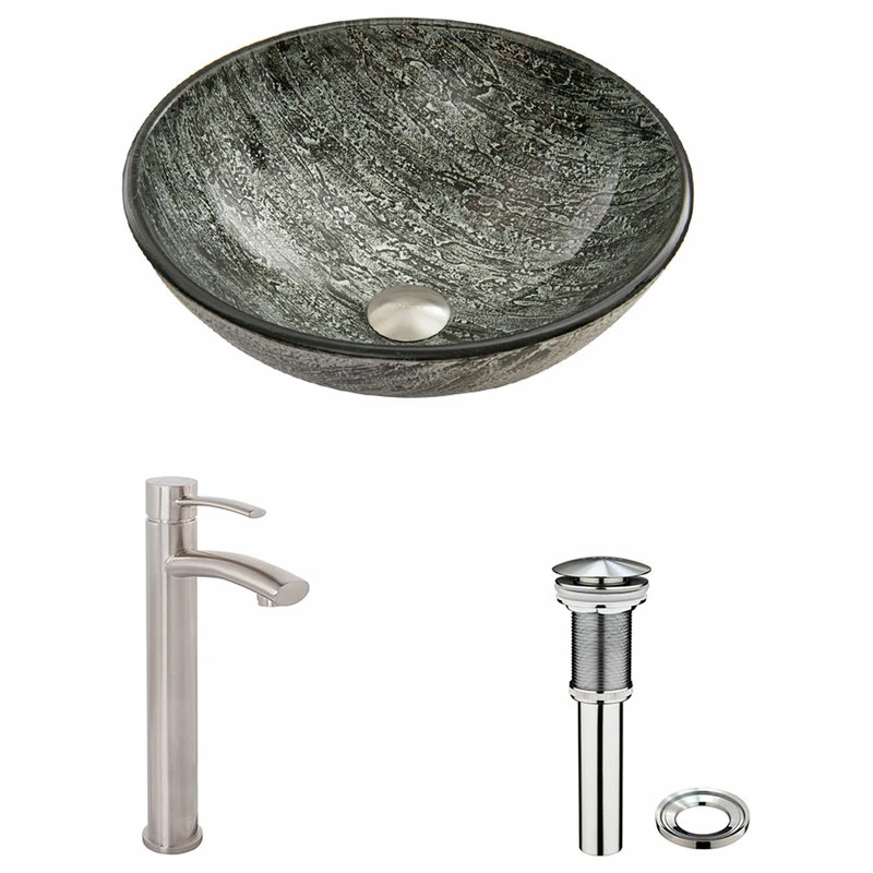 Swirls of silver and black come together beautifully in this Titanium Glass Vessel Sink set. Once you set up the Milo Faucet and pop-up in Brushed Nickel, your bathroom will instantaneously be transformed from drab to fab.