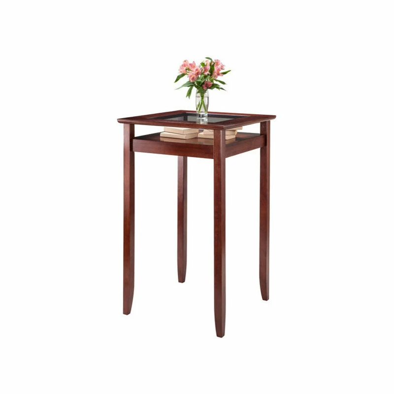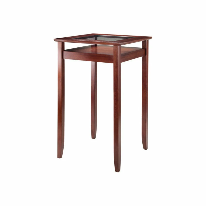 Entertain your guests around this sleek pub table accented with tempered glass providing a clear view to the shelf below. This unique configuration is functional as a display case or even storage for handbags and small accessories. Its long elegant legs lightly holds up the table with it’s slight curved end. Top Dimensions is 25.6W x 25.6D. Shelf is 20.1-22.5W x 20.1-22.5D. Shelf clearance is 3.2H. Distance between legs is 20.1 and the height from the bottom shelf to floor is 25.5. The table is made of solid wood with the glass panel and comes in a walnut finish.